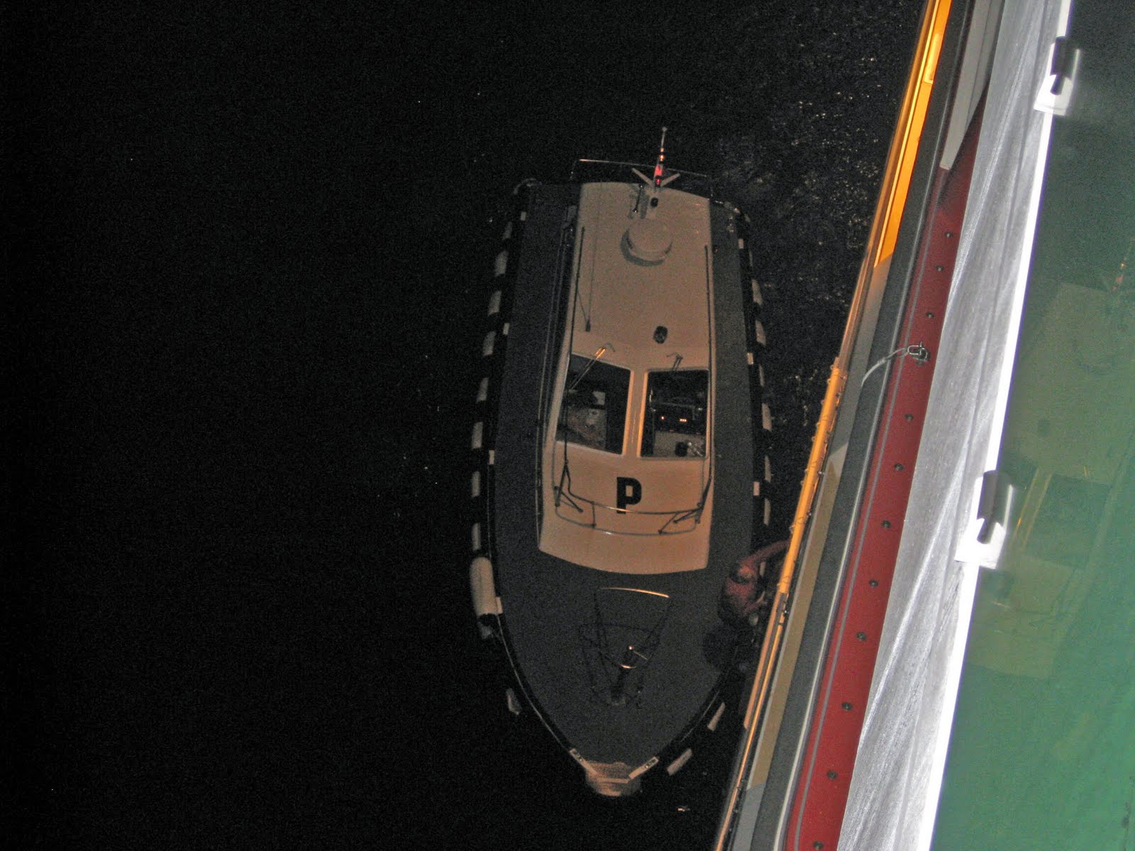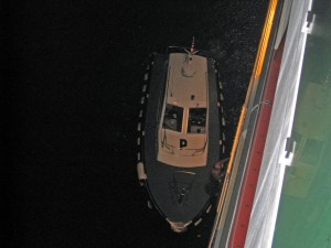 Vi skulle gå fra Civitavecchia/Roma kl. 19, men kapteinen meldte over intercomen at vi ble litt forsinket fordi det var inspeksjon ombord. Kom oss ikke fra kai før ved 22.30-tiden, aner ikke hvorfor. Fikk se losbåten legge til skuta omtrent like under der vi hadde lugarer. Det var litt moro å se den bittelille baljen av en losbåt legge seg inntil Norwegian Gems 93000 tonns skuteside. Vi gikk på dekk for å se utseilingen og fikk se skuta snu på femøringen nok en gang. Imponerende!