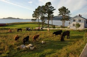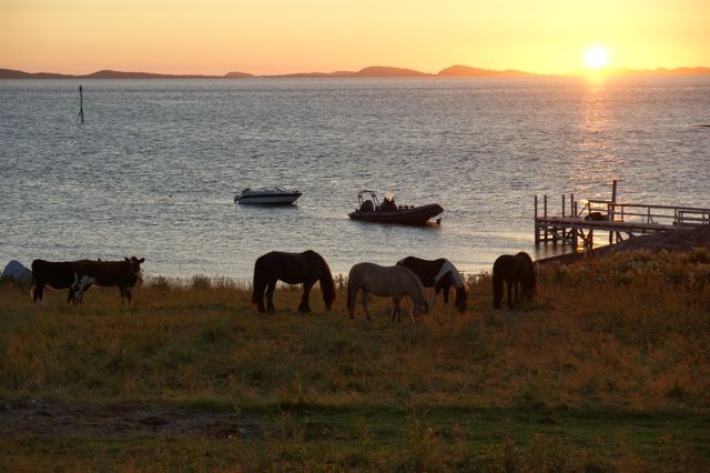 Litt om Buneset: Grunnen til at vi måtte hentes med båt var ikke at stedet lå på ei øy, men at det ikke gikk vei dit fra Tonnes. «Polarsirkelgården Buneset» ligger inne i ei lita vik med brygge hvor man går i land. Anlegget består av en hvitmalt, staselig hovedbygning, et «fjøs», et servicebygg med dusjer og do, og tre rødmalte hytter. Bygningen som så ut som et fjøs og ble kalt «fjøsen» hadde nok aldri inneholdt et eneste dyr. Jeg tror faktisk den var nybygget i «fjøs-stil». Der var det soverom i andre etasje og første etasje inneholdt kjøkken og en nokså stor spisesal. Alt var svært solid og gjennomført skikkelig laget. Gjennom de gardinløse vinduene har man den nydeligste utsikt mot skjærgården med bl.a. Polarsirkeløya og fjellet Hestmannen i sikte. Vi ble ikke lei av det «maleriet».