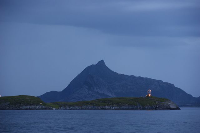 Polarsirkeløya med monumentet belyst, Hestmannen i bakgrunnen