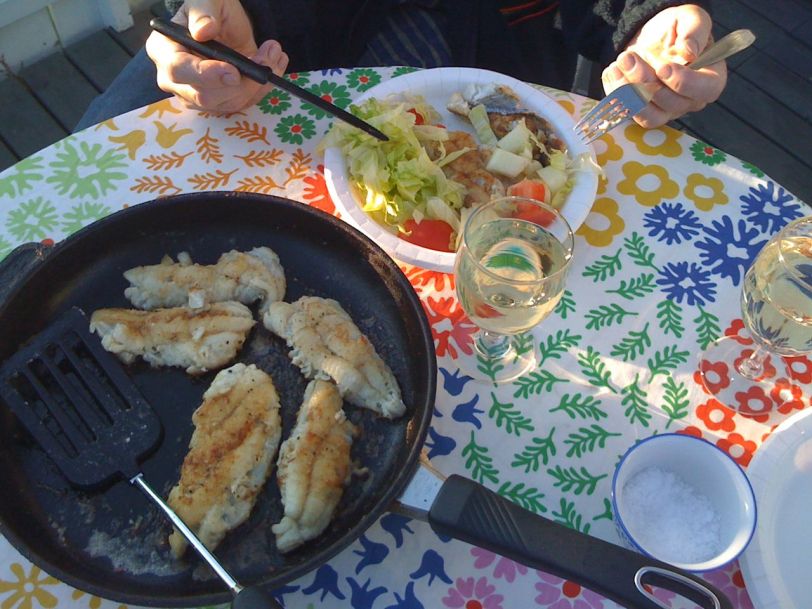 Luksusmåltid: Fersk sei rett fra havet nytes med salat og hvitvin på terrassen.