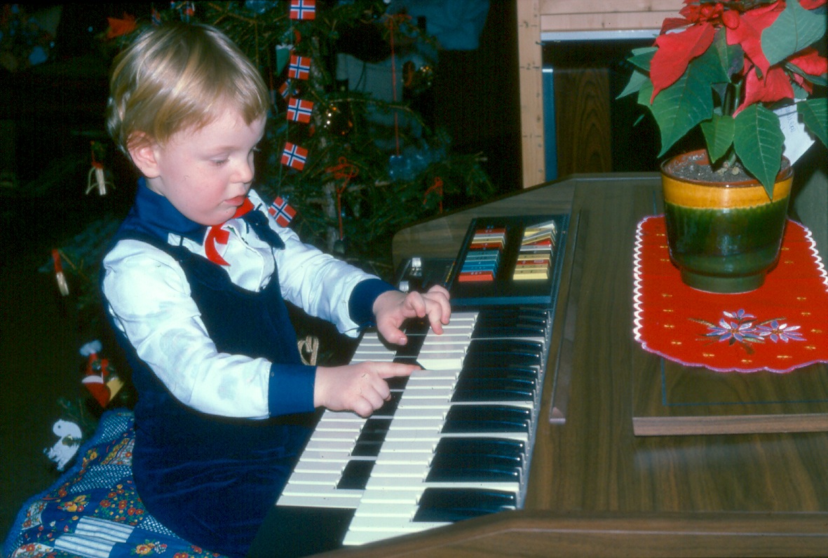 Et elektronisk orgel vi arvet og hadde ganske mange år for at "noen" muligens skulle lære seg å spille på det. Til slutt ga vi det til Kirkens bymisjon i håp om at et musikalsk barn uten instrument kunne få glede av det. Her er det dagens bursdagsbarn som tar noen prøvende toner for ca. 32 år siden.
