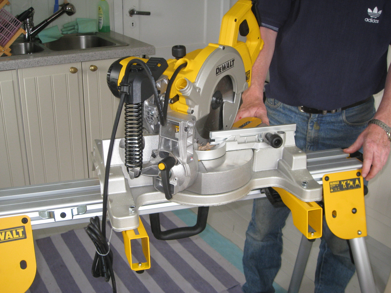 …. at det ikke er godt for noe. Regnvær stoppet utendørsaktiviteten og da kan man for eksempel montere sin nye elektriske DeWalt sag og sagbord. Midt på kjøkkengulvet. Gubben leser og skrur og skrur og leser. På terrassen ligger materialer til etterlengtet nytt utebord og venter. Sjøl holder jeg også på å ordne nyinnkjøpte verktøy, de er dog av en litt mindre skala enn hans. I mange år har jeg ergret meg over at hver gang jeg trenger et skrujern eller ei tang må jeg ut på leting. Rolf Terje legger ikke ting der man skulle tro de hørte til og da blir det mange plasser å lete. Og mye «mustring»!
