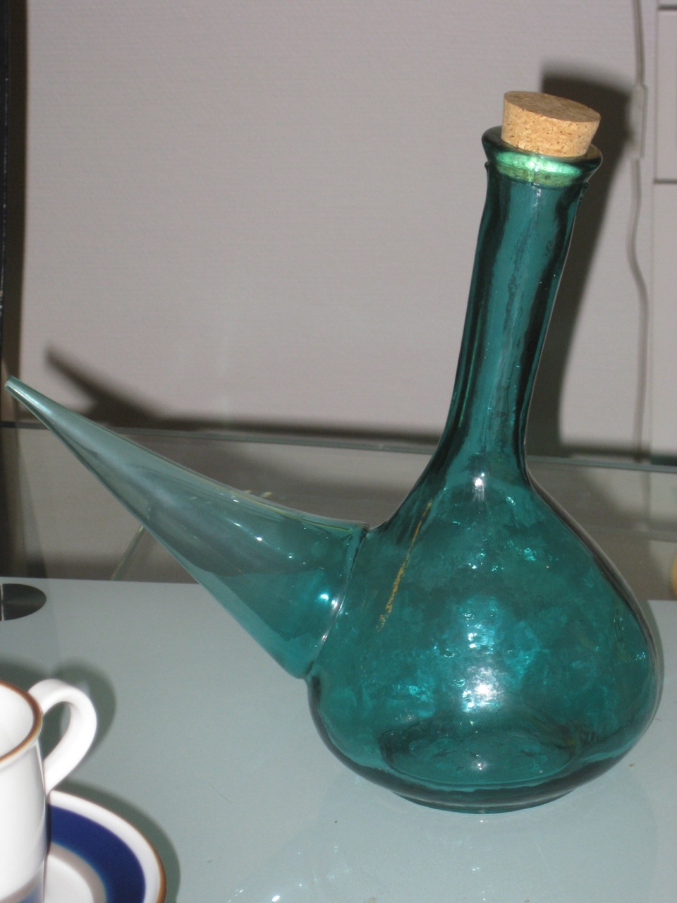 Så har vi kategorien «artige» souvenirer. Dere vet? Slike ting som var veldig fine og morsomme i butikken på Mallorca eller i Madrid, men som aldri riktig har latt seg bruke til noe i vårt liv. Jeg ser på ei spansk vinmugge av glass med en lang, tynn tut – den satt jeg med omtrent på fanget på flyturen heim. Har den noen gang vært i bruk? Mmmm, don`t think so! En søt liten potteskjuler (her snakker vi blomster altså) kjøpt i en artig liten butikk i ei sidegate i Madrid, aldri riktig kommet til sin rett, den er for liten for de fleste behov.