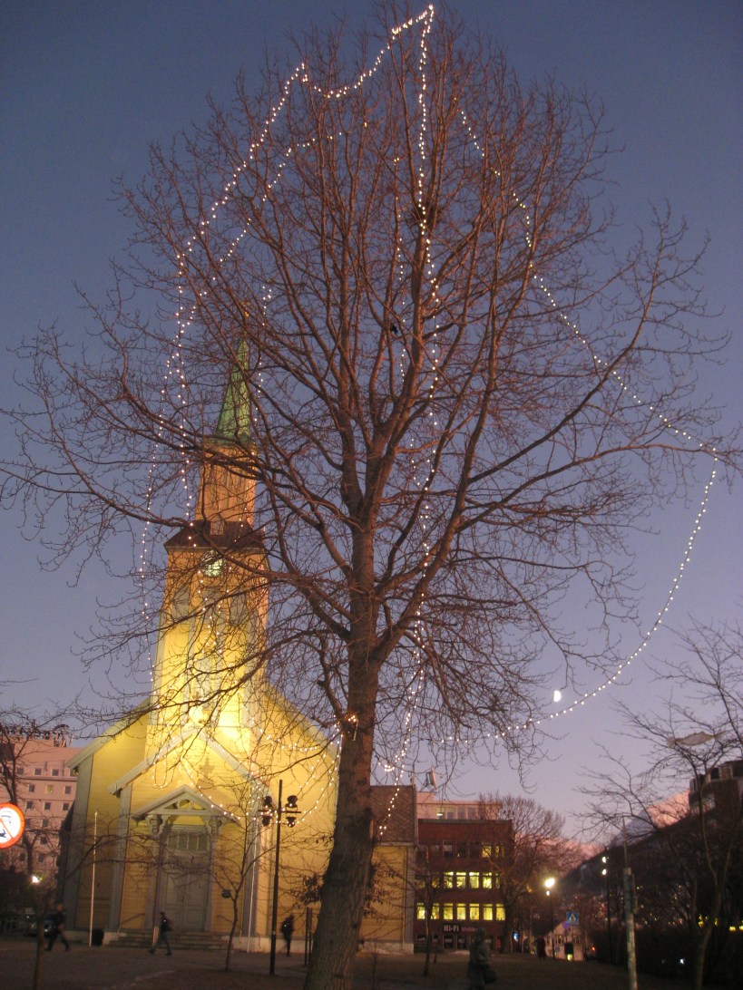 Domkirka og månen, sistnevnte skimtes så vidt innimellom greiene på treet.