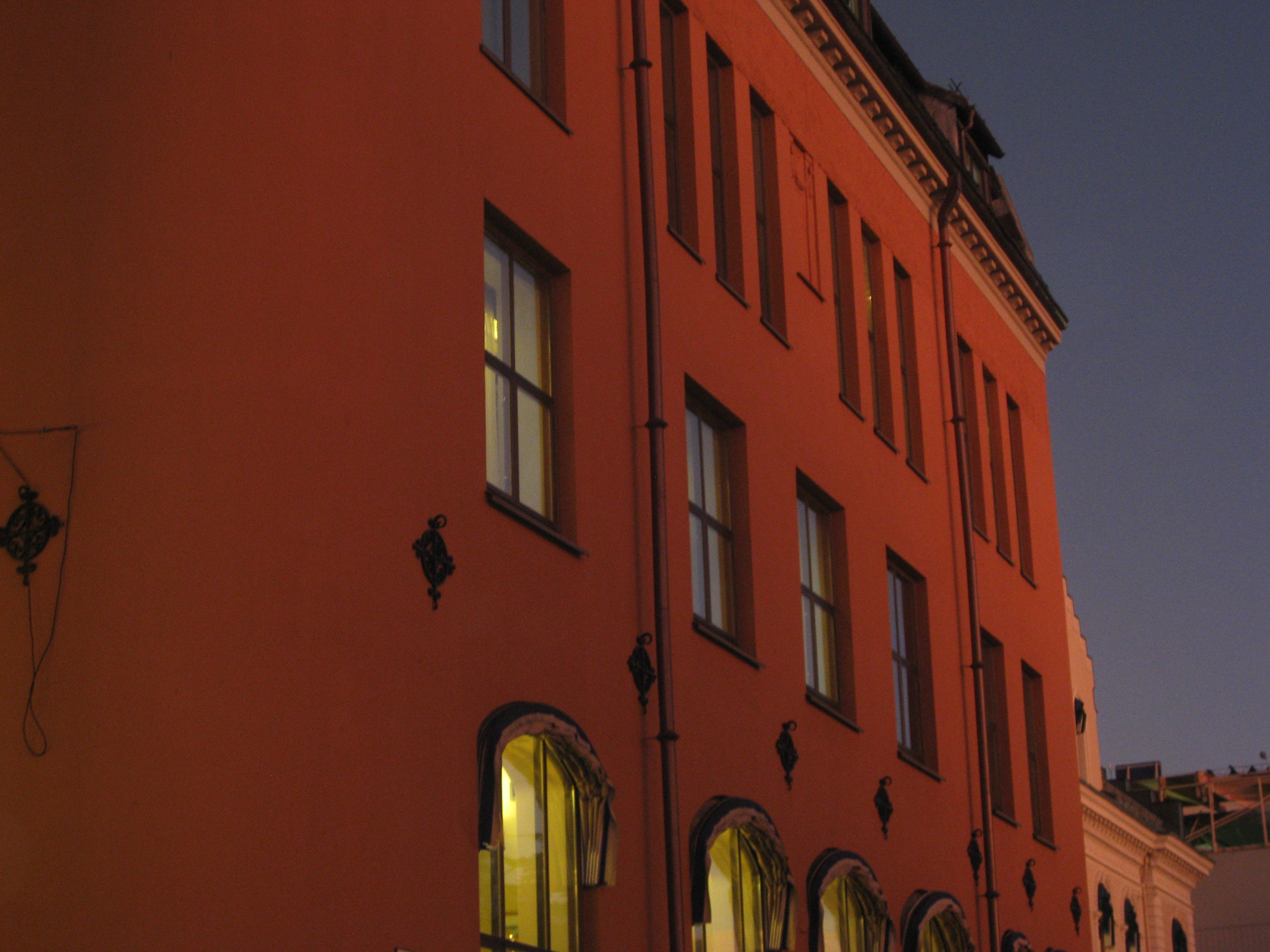 Den gamle «rødbanken» ligger badet i det rosa lyset.