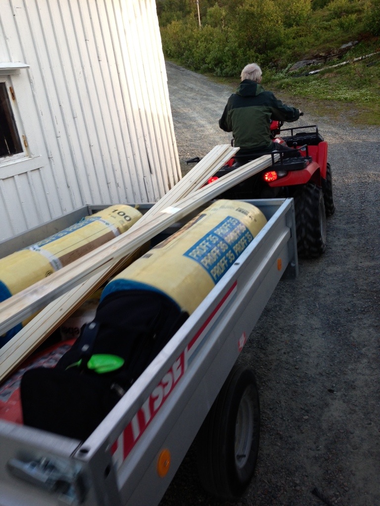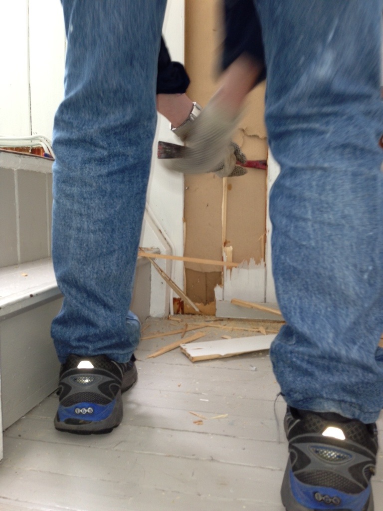 Og det er bare starten. Rolf Terje har starta å rive en av de veggene som skal isoleres innenfra. Loftsgangen er først ut. Det er like ved strøminntaket til huset og sikringsskapet, så det går mye ledninger der og gjør det litt ekstra pirkete å rive. Man må jo rydde unna ting og tang man har hatt stående, bl. i en bod som jeg har malt og som skal ha nye hyller, hvor skal man gjøre av det i et nokså lite hus? Det har nå spredd seg til soverommene foreløpig. Der skal det også etterisoleres etter hvert – tror vi må slå opp telt å sove i!