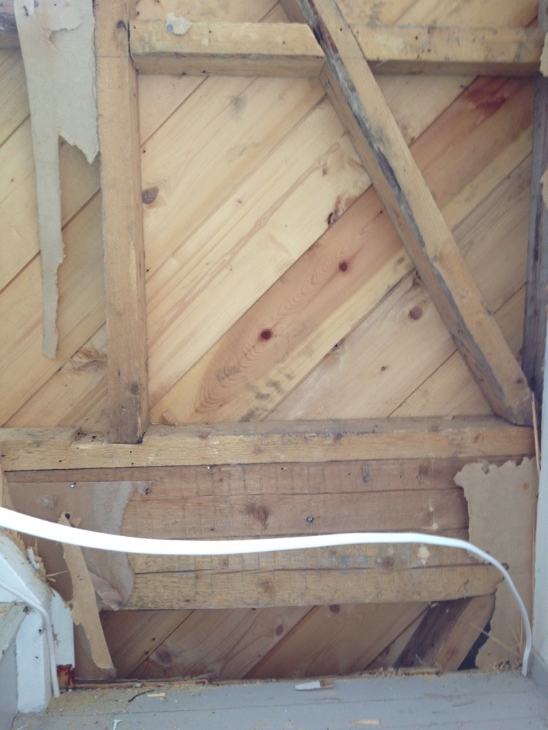 Ingen stor overraskelse at når de gamle innerpanelene rives, er det ikke isolasjon under. Da er det noen grove panelbord, papp og ytterpanel rett på det. Se bilde. Ikke rart gangen (og hele andre etasje) er frysende kald …. Dette er gjenreisningstidens byggeteknikk.