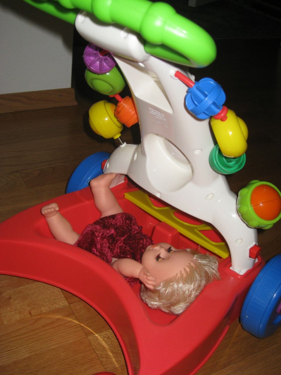 Dukke Lise hviler ut etter et par raske runder på stuegulvet, med innlagte sammenstøt med diverse stoler og bord.
