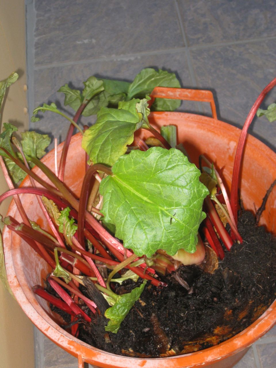 Rabarbrarot fra Beryls hage står ute i svalgangen og «pynter» mens den venter på å få komme i jorda igjen. Håper ikke naboene klager!