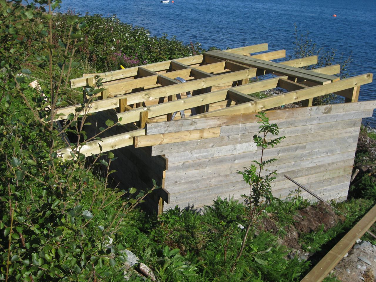 Rolf Terjes byggverk, gapahuken tar form. Den skal ha torvtak og blir nok ikke innviet før neste sommer.