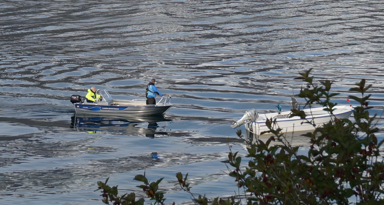 I juni kom Rolf Terje og Roger med den nye båten vår fra Tromsø. Den gamle – her til høyre – tok de med seg tilbake og helt til Harstad. Roger har den på landstedet sitt på Meløyvær. Vi skalerer ned båtstørrelsen etter som årene går og vi blir eldre. Nå tror jeg det er passe!