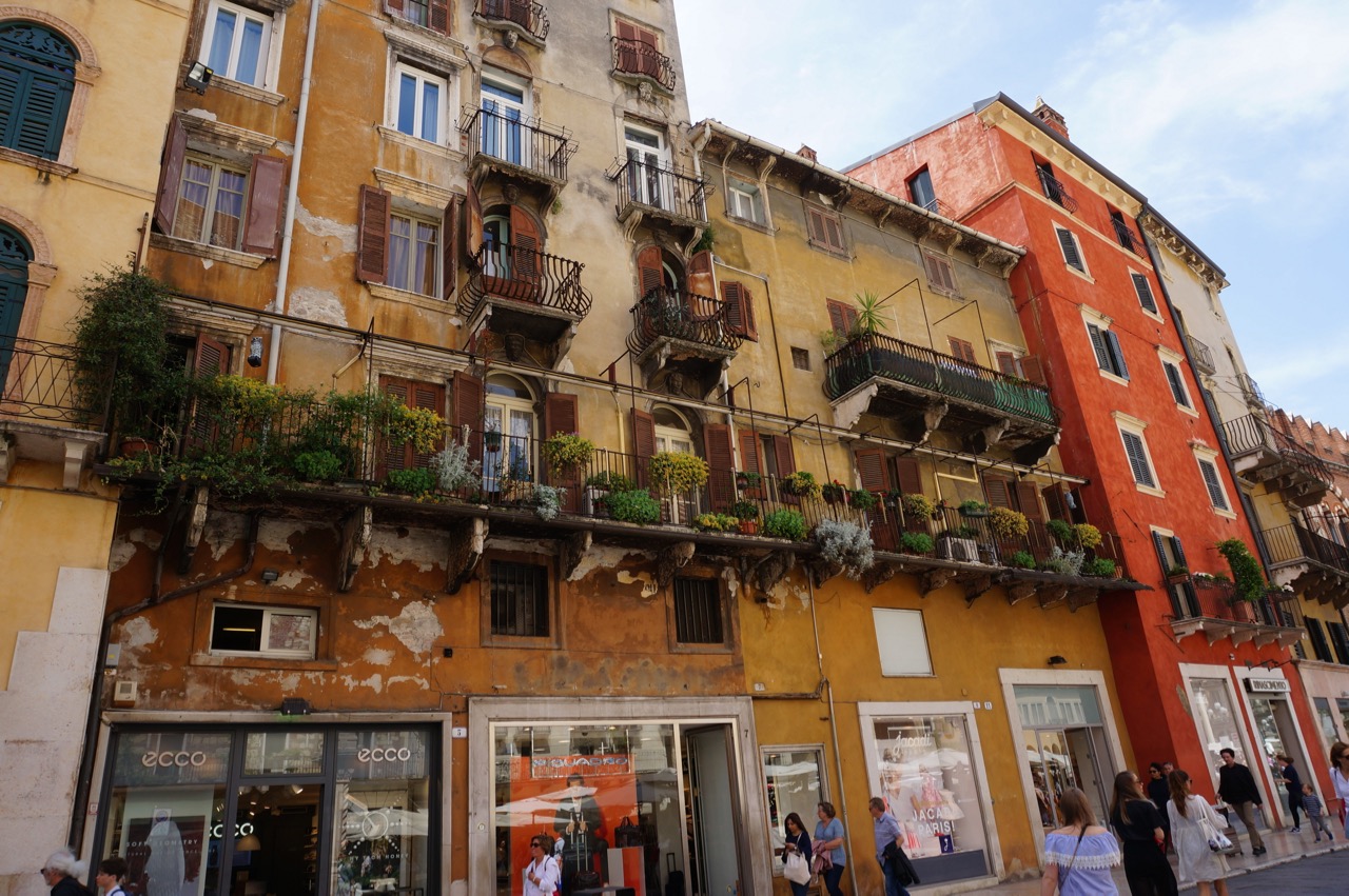 Litt falmet og avskallet vegg, men vakre smijernsbalkonger pyntet med grønt og blomster.