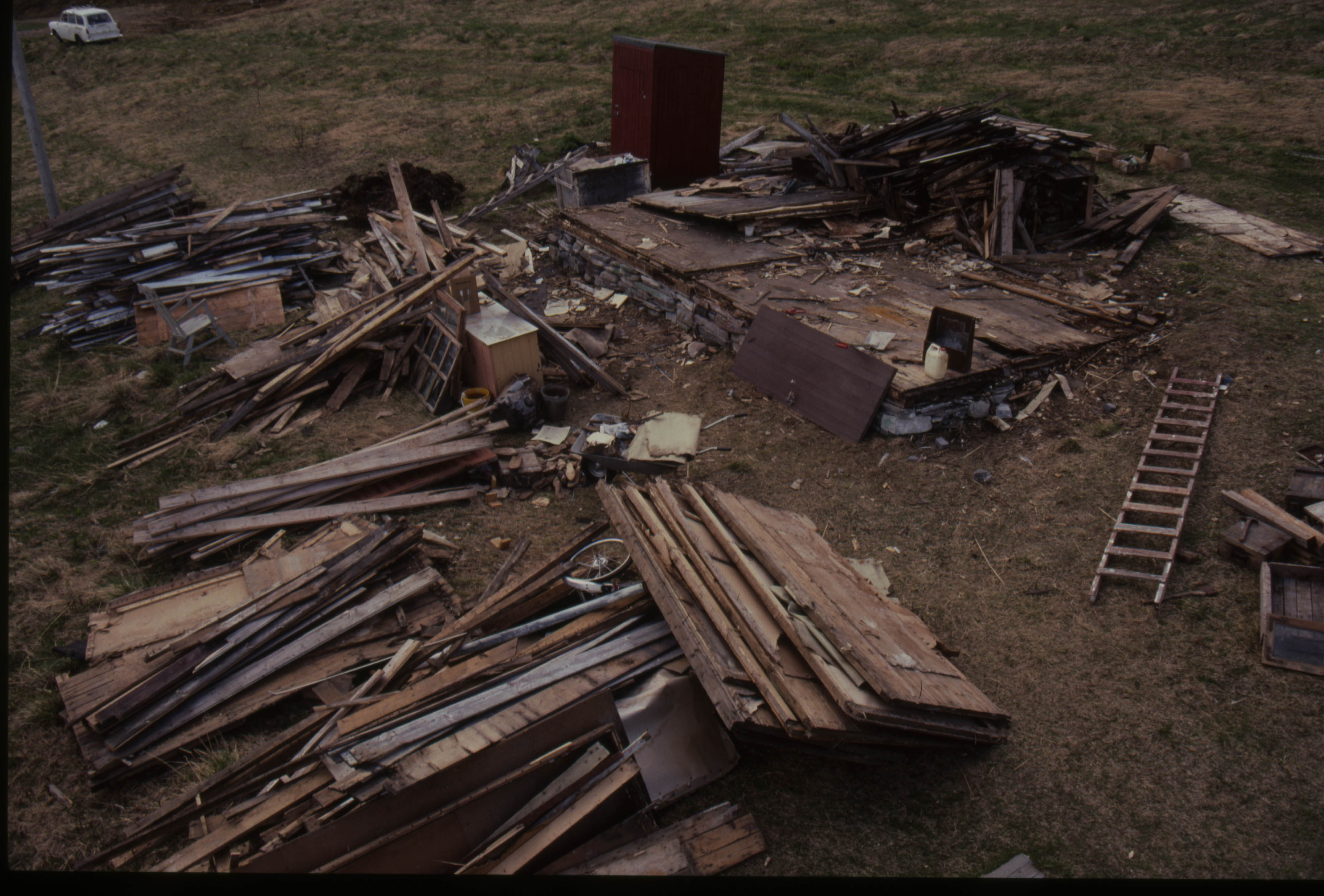 Gammelsjåen var vaklende og ble revet. Vi benyttet anledningen til dugnad med å få alt ned til fjæra. Det ble et stort bål og en fin fest.