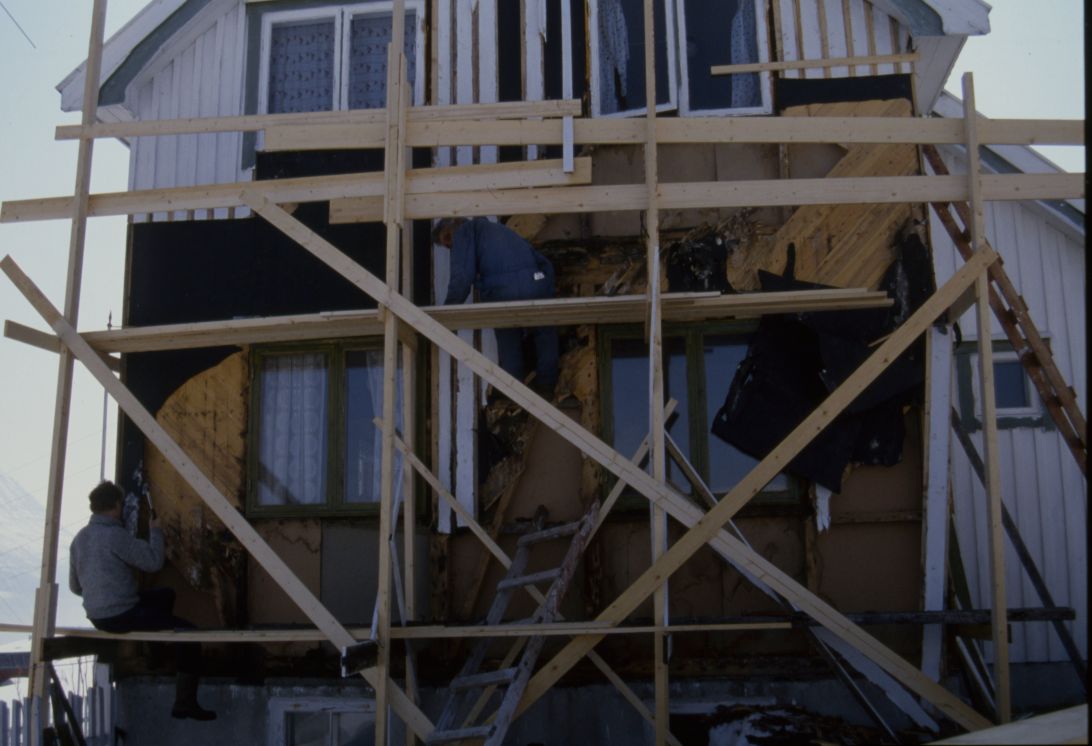 Kristian og Per reparerer nordveggen. Det er våren 1985, en kald vår med mye sludd.