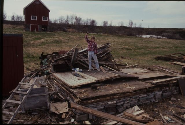 Terje vifter med brekkjernet og er fornøyd med at den falleferdige sjåen endelig er borte.