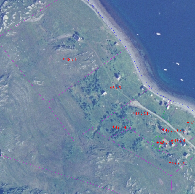 Mellemjord merket 48/5 og våre nærmeste naboer. Man ser tydelig at veien ender der hvor vår eiendom begynner. Det skyldes vel hovedsakelig at min far var en stabeis og nektet å avgi grunn til veien. Vi er ikke direkte lei oss for det nå … selv om vi selvsagt ikke hadde nektet i dag.