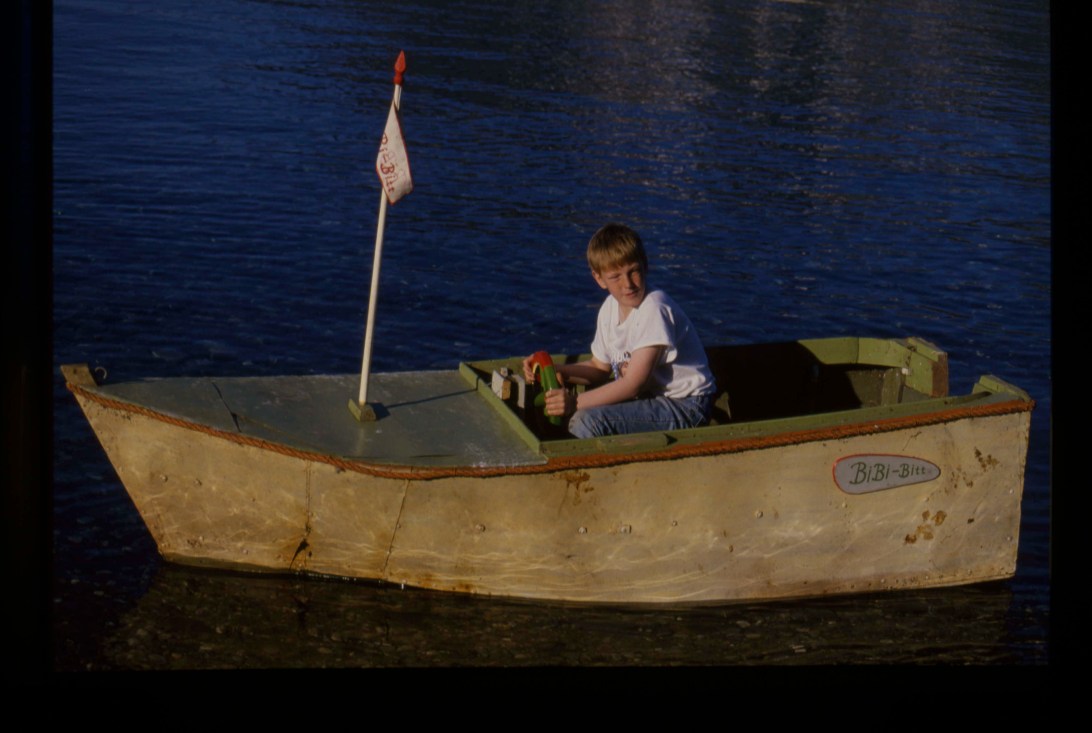 En raritet vi fant i naustet. Dette var noe min far hadde fordrevet tiden med å bygge. Hva slags plan han hadde med den, er uvisst. Den het «BiBiBitt» og var ikke sjødyktig! Her får Terje prøve den oppi fjærsteinene før den gikk på et våre mange bål.